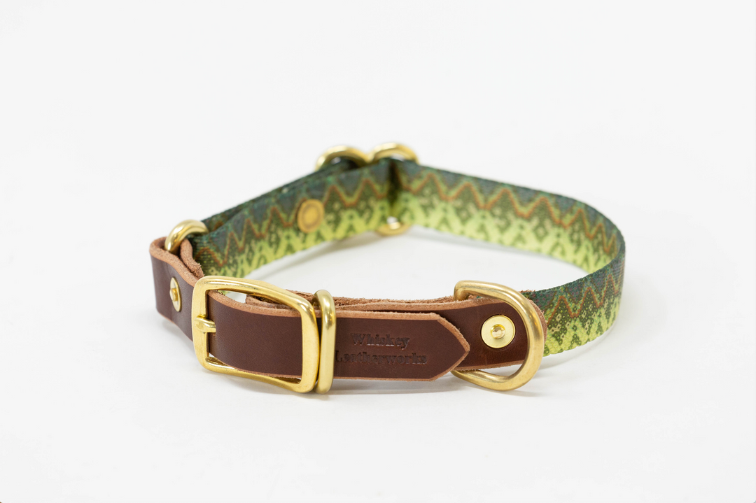 The foundation of these collars is a highly durable, 3/4" webbing for the small collars and 1" webbing for the large collars. The leather we selected is a 6/7 ounce Latigo leather, which will withstand wet/outdoor conditions and is flexible. The buckles, D-rings, and rivets are all made of solid brass to resist corrosion. No plastic "hardware".